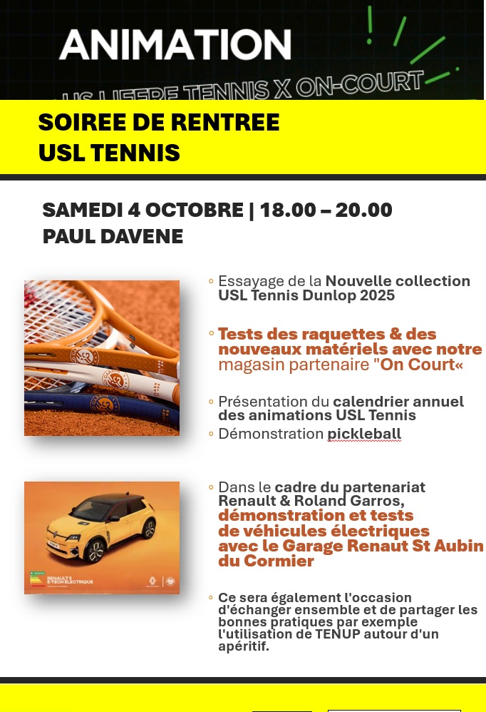 USL TENNIS | Samedi 4 Octobre 18h-20h | Test matériel Tennis, voiture Renault Electrique & nouvelle collection