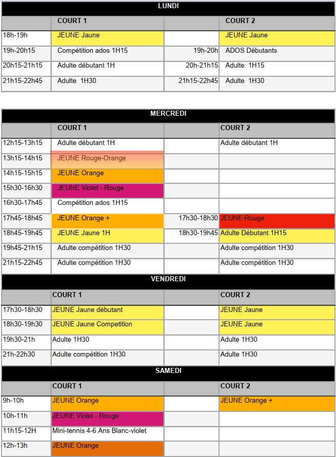 Pour la saison 2025-26 le planning d’organisation des cours et niveaux associés est présenté ci-dessous.